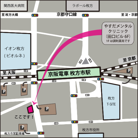 当クリニックは京阪電車の枚方市駅から歩いてすぐのビル6Fにあります。ビルの1Fは調剤薬局になっています。